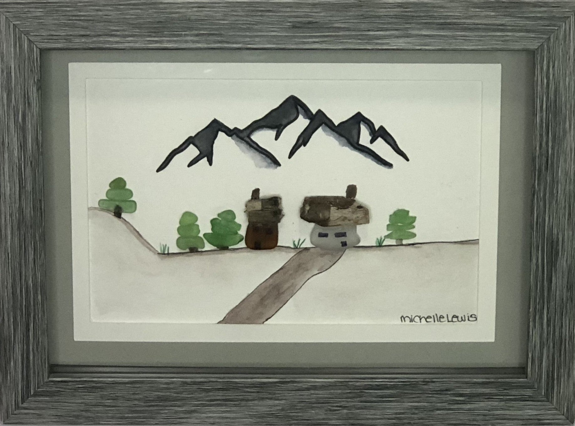 Hand crafted original sea glass picture featuring double mat with hanging hook.