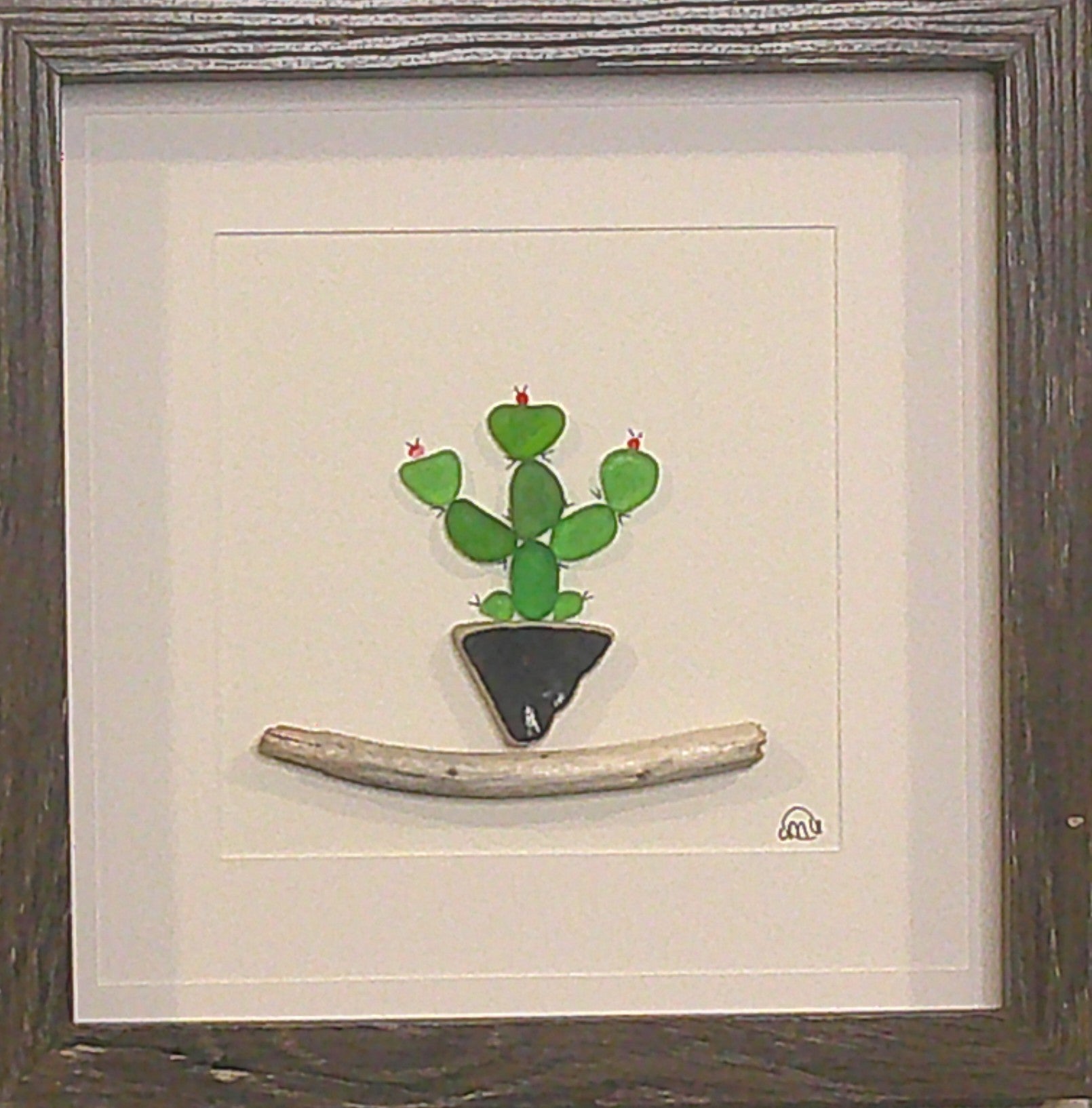 Authentic sea glass cactus featuring green sea glass, ocean tumbled pottery and drift wood.
