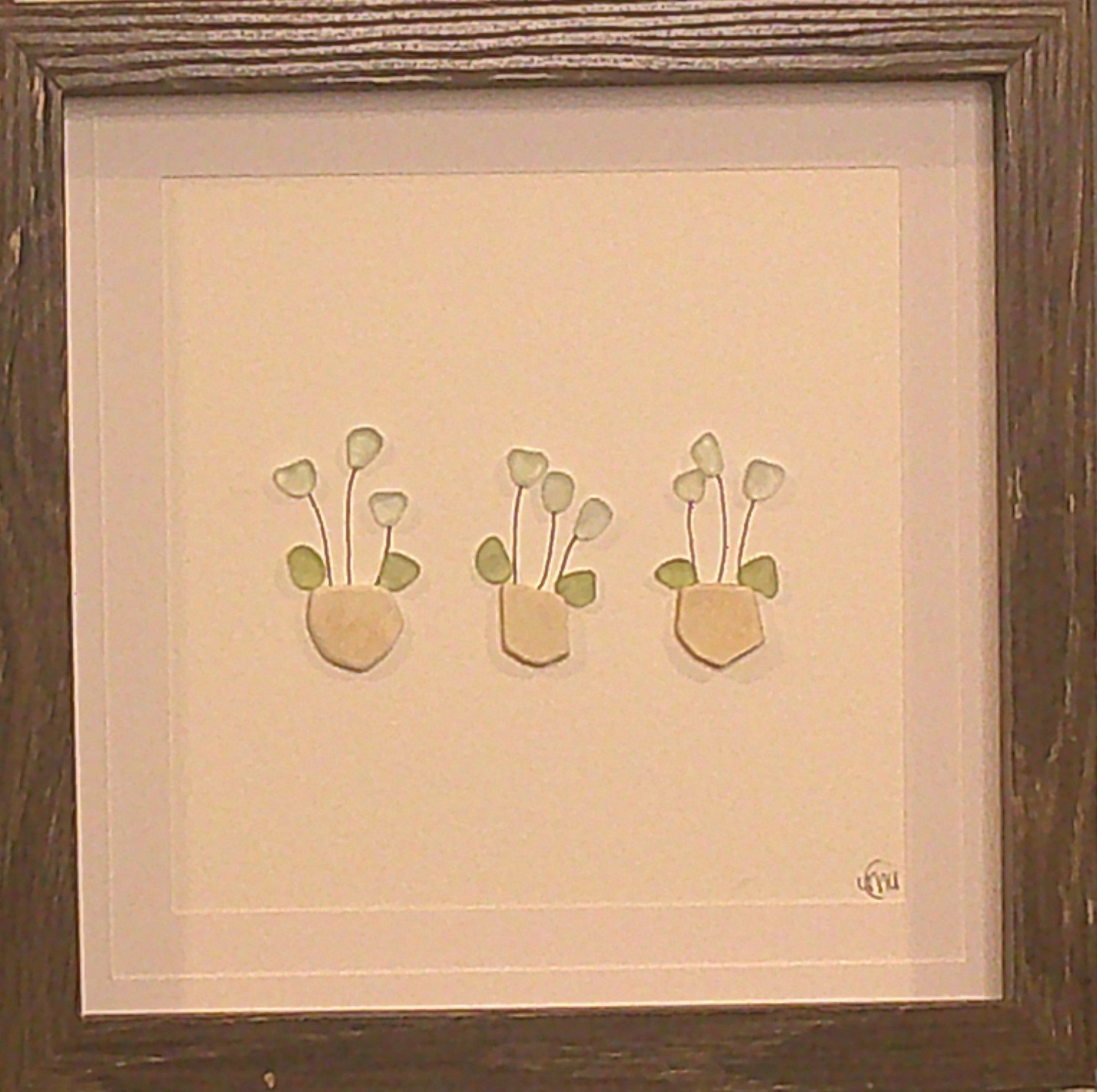 Sea Glass Picture - Flower 3 Pot Blue 2 - 8x8