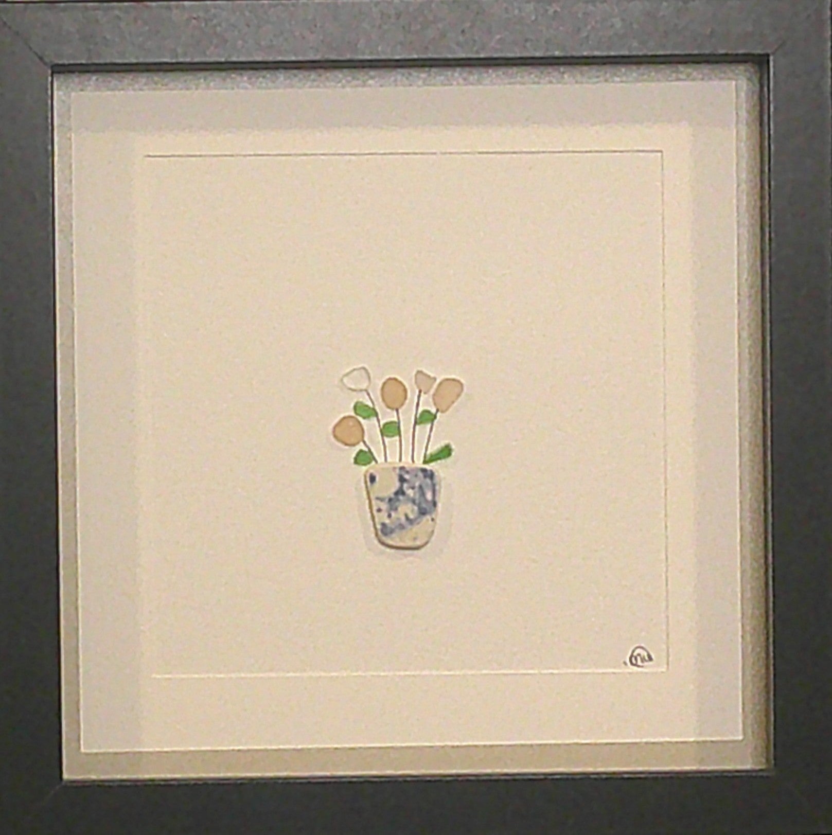 Hand crafted original sea glass picture featuring double mat with hanging hook.