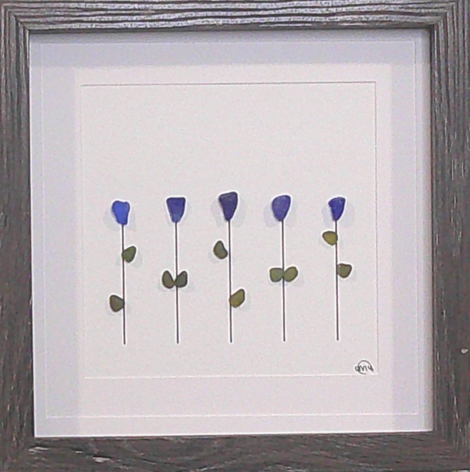 Sea Glass Picture - Flowers 5 Stem Cobalt 1 - 8x8