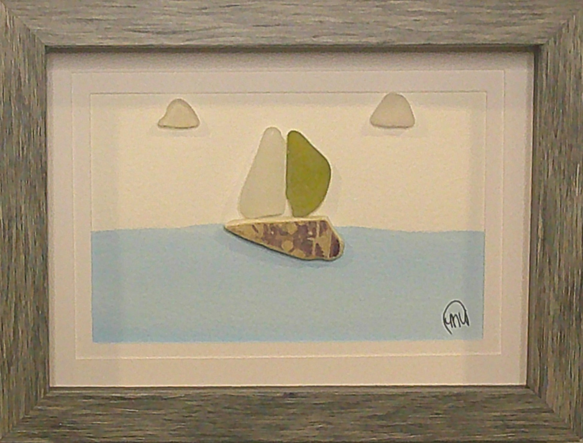 Hand crafted original sea glass picture featuring double mat with hanging hook.