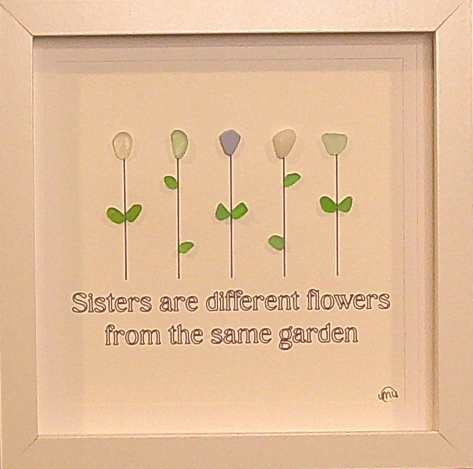 Hand crafted original sea glass picture featuring double mat with hanging hook.